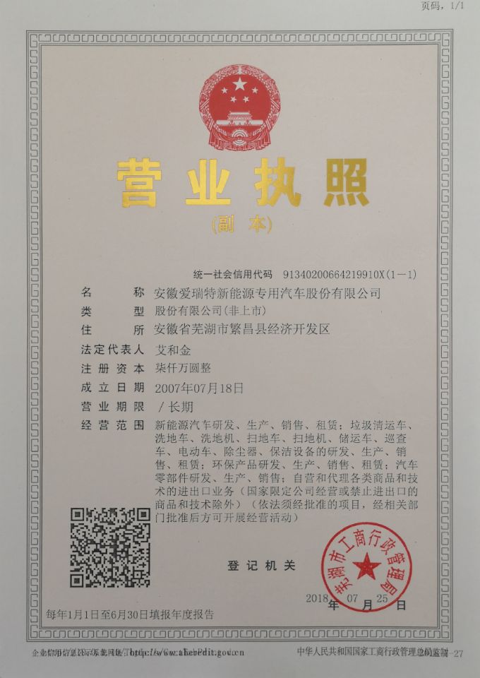 為滿足公司業(yè)務(wù)發(fā)展的需要,經(jīng)蕪湖市工商局核準(zhǔn),依據(jù)《中華人民共和國公司法》的相關(guān)規(guī)定,原“安徽愛瑞特環(huán)??萍脊煞萦邢薰尽币颜礁拿麨椤鞍不諓廴鹛匦履茉磳S闷嚬煞萦邢薰尽?!屆時(shí),愛瑞特將以嶄新的面貌進(jìn)軍新能源環(huán)衛(wèi)專用汽車行業(yè),為實(shí)現(xiàn)新能源環(huán)衛(wèi)專用汽車的快速發(fā)展貢獻(xiàn)力量。
